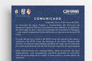 CAPAMA suspenderá suministro de agua por 48 horas en Acapulco