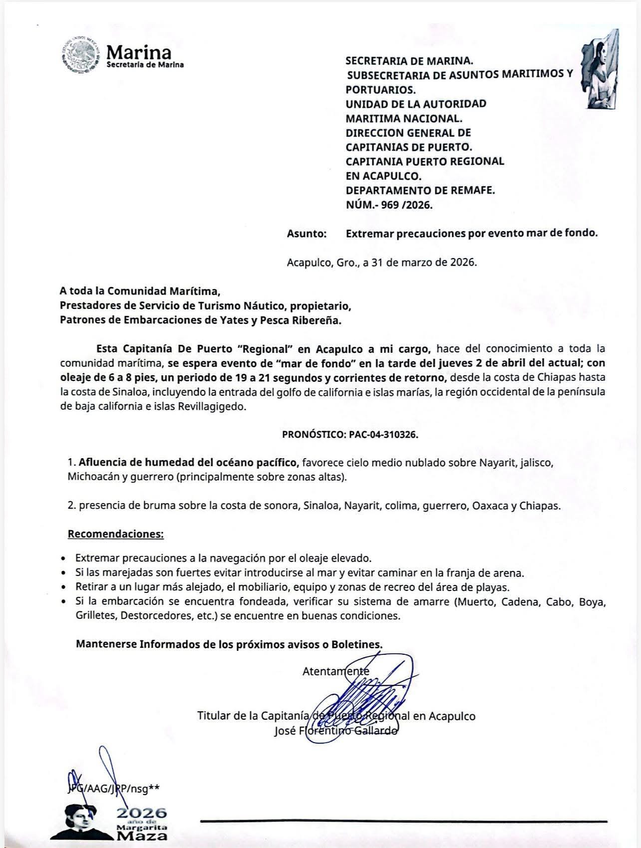 La Capitanía de Puerto Regional en Acapulco, dependiente de la Secretaría de Marina, emitió un aviso a la comunidad marítima y prestadores de servicios turísticos ante la presencia de un evento de mar de fondo previsto para la tarde del jueves 2 de abril.